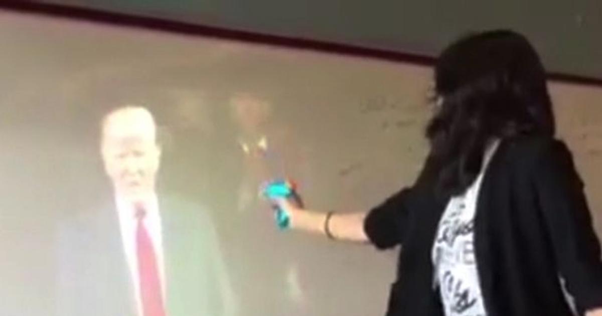 An Indian-origin teacher has been suspended after a video of a controversial classroom stunt that shows her firing a water gun at an image of President Donald Trump and yelling "die" went viral online.