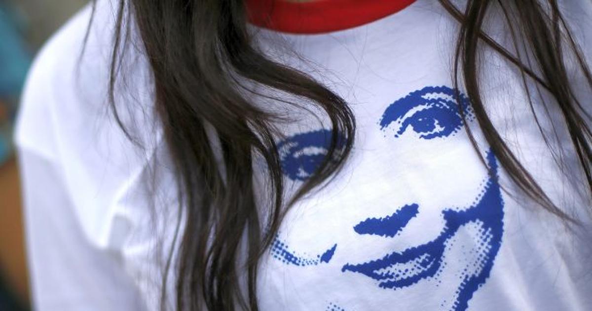 Image: A supporter of Hillary Clinton wears a T-shirt with an image depicting her. Photograph: Jonathan Ernst/Reuters