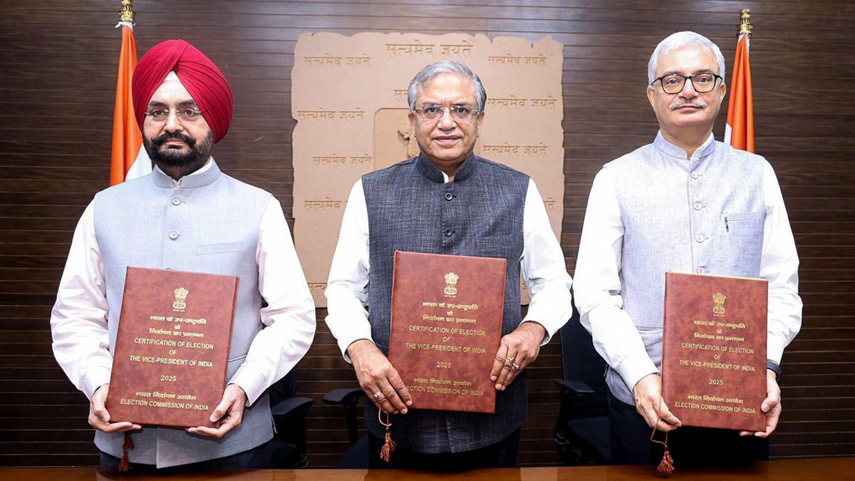 The vice-presidential election 2025 culminated with the signing of the certification of C P Radhakrishnan's election as the 15th vice president by Chief Election Commissioner Gyanesh Kumar and Election Commissioners Sukhbir Singh Sandhu and Vivek Joshi in New Delhi.
