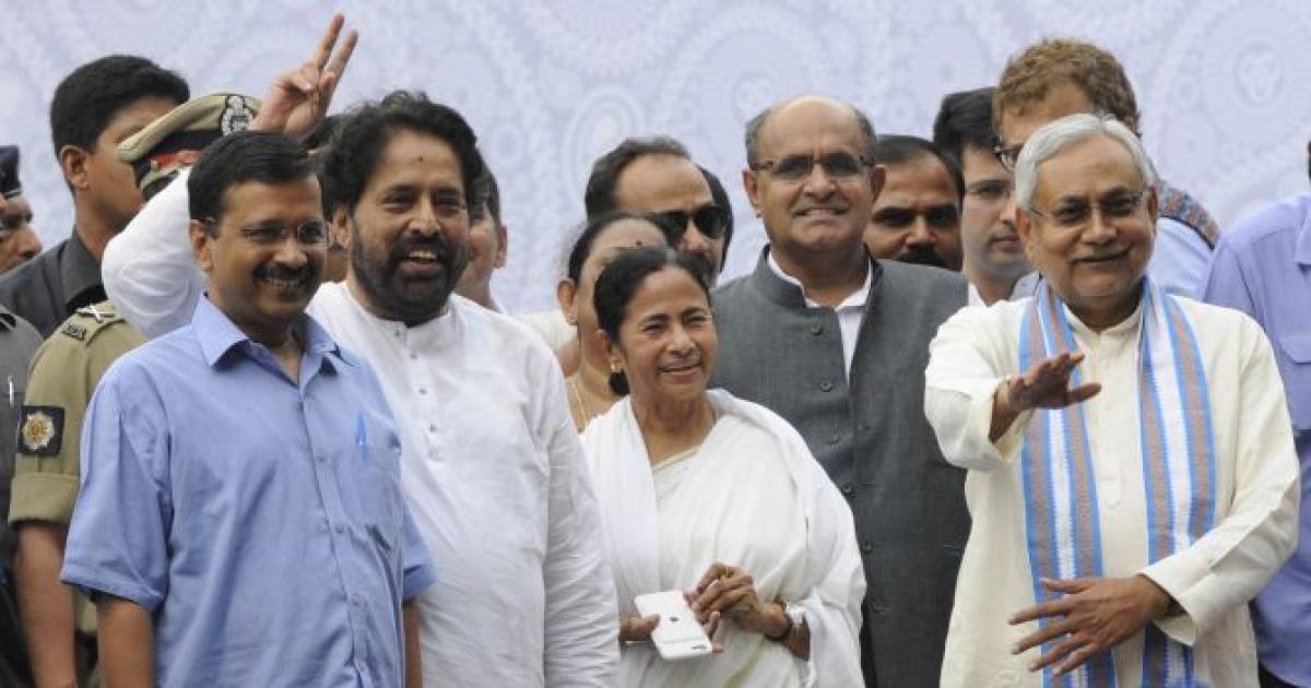 IMAGE: Mamata Banerjee with Bihar Chief Minister Nitish Kumar and Delhi Chief Minister Arvind Kejriwal, JD-U leader K C Tyagi and other TMC leaders at her swearing in ceremony. Photograph: Abhiroop Dey Sarkar