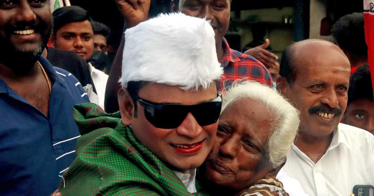 IMAGE: AIADMK candidate Daniel Sachin Mani, who is contesting from the 35th ward of Perambur constituency, dressed up as his party's founder MGR, greets a voter at Moolakadai, Chennai, February 7, 2022, during his campaign for the Tamil Nadu Urban Local Body Elections.