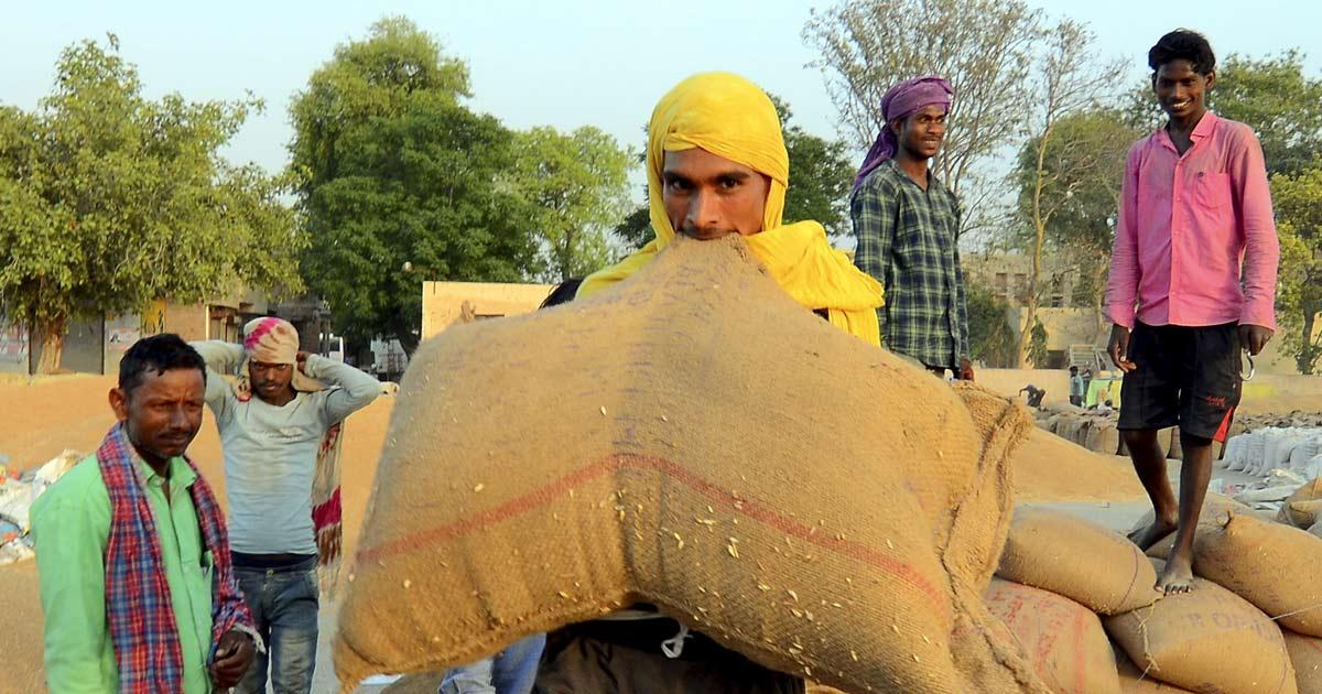 IMAGE: A labourer lifts a 50 kg bag of wheat using his teeth at a grain market in Bathinda, April 17, 2022. He won a small amount of prize money for his feat.