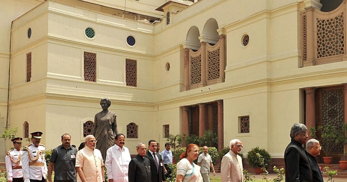 Image: President Pranab Mukherjee being led in a ceremonial procession to the Central Hall of the Parliament House to address the Joint Session of the Parliament, in New Delhi. Vice President Hamid Ansari, Lok Sabha Speaker Sumitra Mahajan, Prime Minister Narendra Modi and the Union Minister for Urban Development Housing and Urban Poverty Alleviation and Parliamentary Affairs M Venkaiah Naidu are also seen. Photograph: Press Information Bureau