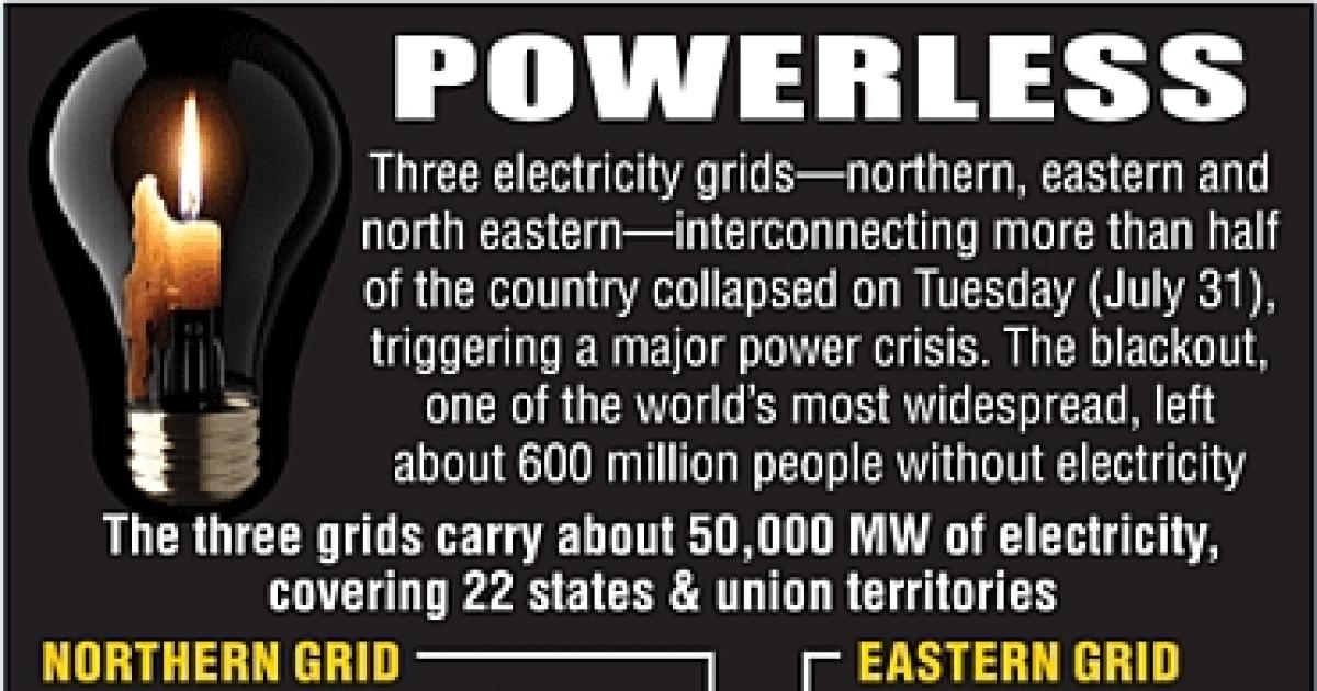Two consecutive days of grid collapse has left almost half of India's population without power. Three major grids -- northern, north-eastern and eastern -- have crashed. Reportedly, over 20 states have been affected. Trains have stalled, markets have closed down, and institutions and offices have been forced to announce holidays.