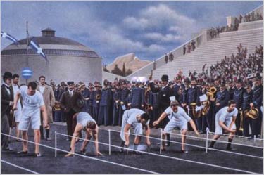 Athletes in the 100 metres final await the firing of the starters gun at the 1896 Olympic Games held in Athens, Greece.