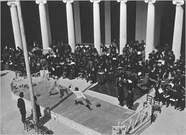 Aerial view of two competitors in action in the Foil event during the 1896 Olympic Games in Athens, Greece.