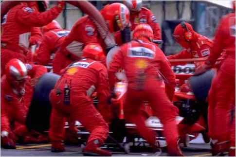 Glory on Wheels Belgian GP 2000: 27 Aug 2000: The Ferrari pit crew in action during the Belgian Formula One Grand Prix at the Circuit de Spa-Francorchamps in Belgium. Mika Hakkinen pulled off a brilliant win at the Belgian Grand Prix which kept him in the lead ahead of Schumacher in the Championship points. Mark Thompson /Allsport |
