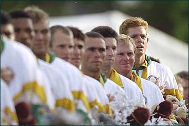 Winning captain Shaun Pollock of South Africa on the podium after defeating Australia in the cricket final during the Commonwealth Games in Kuala Lumpur, Malaysia.