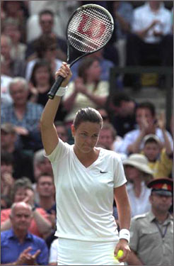 Defending champion Lindsay Davenport acknowledges the crowd's applause after beating Jelena Dokic 6-4 6-2 to enter her second consecutive Wimbledon final.