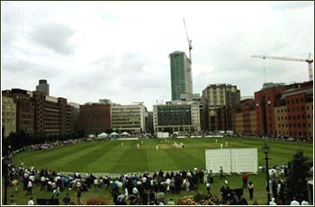 The venue for the 35 overs memorial game, played to raise money to support Marshall's wife Connie and son Mali, was the Honourable Artillery Company Ground, a compact, green oasis hidden in the heart of the financial district of London, surrounded by office blocks. It was here that the first recorded game of cricket took place, in 1725. The scorecard read like a Who's Who and a Who Was Who of international cricket. Captaining the Malcolm Marshall XI was Sir Viv Richards, while Robin Smith, of Hampshire and England led out the opposition, the International Professional Cricketers' Association Bunbury XI. The proceedings began on a sombre note, with The Last Post being played and echoing around the ground, followed by a minute's silence, with all the players lined up on the pitch. But the rest of the day was a celebration of the life of a great cricketer and a highly respected and much-loved human being. Sir VIv won the toss and inserted the opposition, saying: 'I can always rely on my bowlers.' And what a line-up he had. Glenn McGrath opened from one end, while Michael Holding was tossed the ball to open from the other end. There was plenty of backing for those two in a side which would have been any Test batsman's nightmare. Also up his sleeve, Sir Viv had Wasim Akram, Courtney Walsh, Joel Garner and Ian Bishop. And if he wanted to vary that diet of extreme pace, he could always whistle up Shane Warne, Phil Simmons, Alvin Kallicharan and Collis King? First out to face the awesome attack were former Northamptonshire and England player Wayne Larkins and current Worcestershire and England batsman Graeme Hick. This being a charity game, however, the runs came easily and the bowlers did not come off their full run-ups. Michael Holding did once come off a longer run-up, reminiscent of the style that had won him the sobriquet of 'Whispering Death', but he stopped short of actually releasing the ball. Even off a short run, it was still a memory to treasure, though, to see that gloriously fluid approach, to see how Holding made the ball all but talk, and to think back to what he was in his heyday. Courtney Walsh added to the fun by doing a more than passable impersonation of Marshall himself, with his angled approach to the wicket, pumping run and extravagant follow-through which left him eyeball to eyeball with the batsman. The batting to follow was Graham Thorpe, Mark Nicholas (captain of Malcolm Marshall's county side Hampshire for 10 years between 1985 and 1995, and now the voice of Channel 4 cricket in the UK) who hit memorable sixes off the bowling of Shane Warne and Sir Viv, Allan Lamb who dispatched the bowling to all parts of the ground to make a rapid and explosive 70, and Mark Butcher who also played well for an unbeaten 50. You could sense that Butcher felt he had a point to prove, having not only been ignored by England this season, but having also been left out of his county Surrey's side in an important Nat-West Trophy quarter-final against Lancashire on Tuesday. The Malcolm Marshall team amassed a total of 239. The memories flooded back again when the Malcolm Marshall team emerged to bat. The opening pair who strode to the crease were none other than Gordon Greenidge and Desmond Haynes. They put on 88 for the first wicket against an opening attack of Alan Mullaly and Tim Munton. Greenidge hit a glorious cover drive to get off the mark. Haynes was smiling throughout and was as jokey as ever, at one stage falling down and rolling around on the ground pretending to be in agony after he was hit in the box by a ball from Tim Munton. Still to bowl were Mike Gatting, Graeme Hick and Phil Tufnell (who, in customary fashion had done his pre-match training in the hospitality bar with cigarettes and bottles of beer). But the fall of Desmond Haynes, allowing himself to be bowled by Mike Gatting for 53, was to lead to the biggest cheer of the day. It was a standing ovation to greet the arrival of Sir Vivian Richards to the crease. Again the memories came flooding back, as he swaggered and swayed to the crease, intimidating the bowler before he even arrived. One of his two sixes was a beautiful straight shot bludgeoned over mid-off from the bowling of Graeme Hick, after which he memorably gave himself room to cut through the off-side. However it was a sparkling but short innings. On 35, he fell to a superb diving catch on the boundary from former England fast bowler David 'Syd' Lawrence, from the bowling of David Graveney, now the England chairman of selectors.