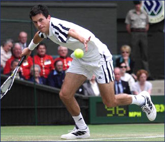 Tim Henman plays a passing shot against Ivanisevic's conqueror Arnaud Clement. However, Clement's run came to a premature end in the second round as Henman came through 6-4 6-4 6-4.