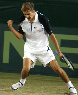 Nicolas Escude (L) maintained his 100% Davis Cup singles record with his eighth win in the tournament.
