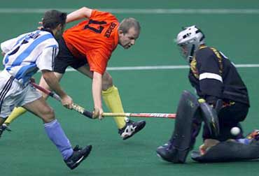 Fabian Berger of Belgium slots the ball past Argentina goalkeeper Pablo Moireira before defender Ezequiel Paulon can fall back, during Monday's match at the Bukit Jalil national hockey stadium, in Kuala Lumpur. Argentina recovered from that goal to win 3-1.