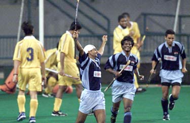 Forward Prabhjot Singh celebrates along with Dhanraj Pillay (centre) and Deepak Thakur after putting India ahead in their match against Malaysia on Monday. But it was the Malaysians who had the last laugh, scoring twice thereafter to register an upset 2-1 victory.
