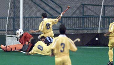 The Malaysian defenders are left stranded as Prabhjot Singh (on the ground) scores after breaking through.