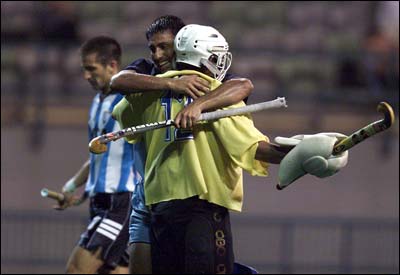 India's goalkeeper Jude Menezes, who came up with a fine display, is congratulated by team mate Thirumalvalavan after the match against Argentina.