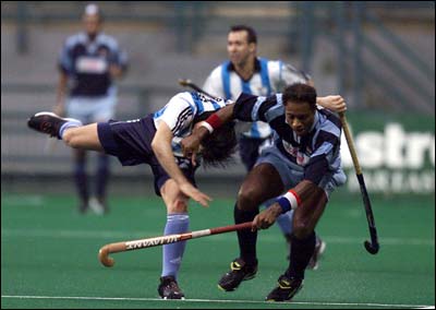 Santiago Capurro of Argentina makes a vain bid to stop Bipin Fernandez.