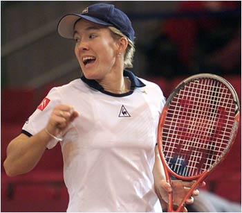 Justine Henin of Belgium celebrates after her victory over Nadia Petrova of Russia in the Federation Cup World Final. Henin strolled to a 6-0, 6-3 victory .