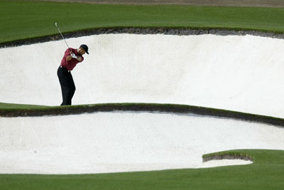 Tiger Woods of the USA plays out of the bunker on the eighth hole during the final round of the Masters Tournament from the Augusta National Golf Club in Augusta, Georgia.
