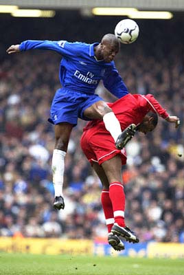 William Gallas of Chelsea rises above Nicolas Anelka of Liverpool during the FA Barclaycard Premiership match played at Anfield, in Liverpool, England. Liverpool won the match 1-0.