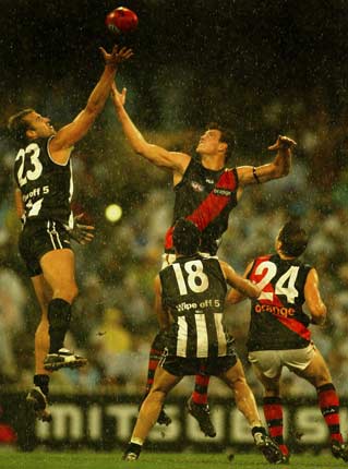 Anthony Rocca #23 for Collingwood beats David Hille #34 for Essendon in the ruck, during the Round 5 AFL Anzac Day match between the Collingwood Magpies and the Essendon Bombers, played at the MCG, Melbourne, Australia.