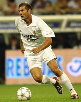 Zinedine Zidane of Real Madrid on the ball during the Real Madrid Centenary Tournament Final between Real Madrid and Bayern Munich at the Santiago Bernabeu Stadium in Madrid, Spain