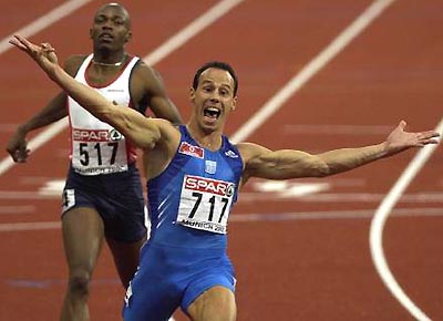 Konstantinos Kenteris of Greece celebrates winning the Men's 200 metres Final at the 18th European Championships in Athletics at the Olympic Stadium in Munich, Germany.