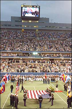 A color guard unfurls an oversized American flag at center court during the opening ceremony of the US Open, at the USTA National Tennis Center in Flushing Meadows, Corona Park, New York.