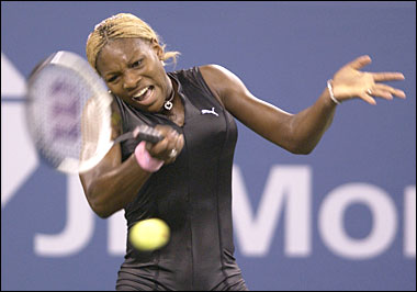 World No. 1 Serena Williams, shimmering in a short-legged, all-in-one, black leather-look, skin-tight outfit, dazzled during her match against fellow-American Corina Morariu.