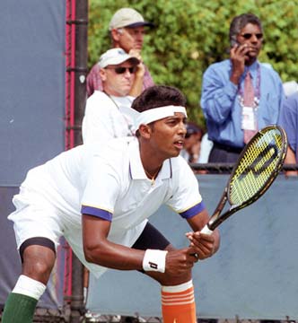 Prakash Amritraj, who got a wild card to the men's singles at the US Open by winning the USTA Under-18s Super National Hard Court Championships, gets ready to receive serve in the men's doubles match against Frantisek Cermak and Ota Fukarek of the Czech Republic on Tuesday. Prakash [19], partnering his cousin Stephen [18], went down 3-6, 3-6 in a first round match. Backing the duo from the sidelines was Prakash's father, former Indian tennis ace Vijay.