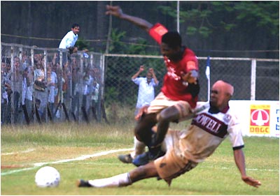 Mahindra United's Odartey Lawson tries to evade a sliding tackle by Isa Musa Eroje.
