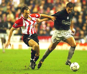 left: Joachim Bjorklund of Sunderland clashes with Milan Baros at the Stadium of Light in Sunderland, England.
