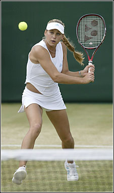 Anna Kournikova of Russia, who partnered Chanda Rubin of the United States, in action during the women's doubles match against Janet Lee of Taipei and Wynne Prakusya of Indonesia.