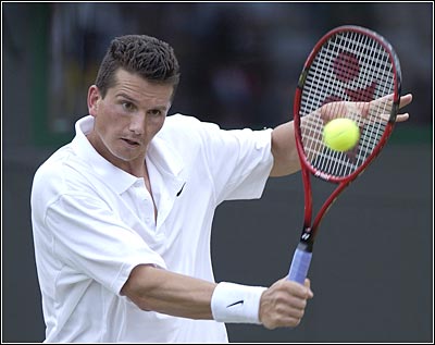 Day Eight1996 Wimbledon champion Richard Krajicek of the Netherlands in action against Mark Philippoussis of Australia in the men's singles quarter-finals. The two were locked two sets apiece when play was suspended for the day.Images: Getty Images BACK | NEXT