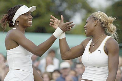 Venus and Serena celebrate after beating L Montalvo of Argentina and E Tatarkova of the Ulkraine 6-2, 6-2 in the women's doubles third round match.
