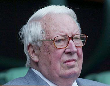 Great Britain's former PM Edward Heath watches the Mens Singles semi- final.