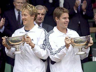Swede Jonas Bjorkman and Aussie Todd Woodbridge celebrate their victory in the Mens Doubles Final. The pair beat Mark Knowles and Daniel Nestor 6-1, 6-1, 6-7, 7-5.