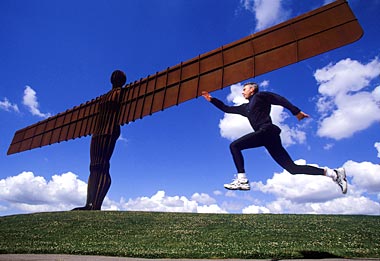 Olympic and World Triple Jump Champion and World Record holder Jonathan Edwards takes a jump at the Angel of the North Sculpture in Gateshead, Great Britain.The sculpture was created by internationally renowned sculptor, Antony Gormley, and is situated next to the A1, at Eighton Banks, Gateshead, Tyne & Wear, England.