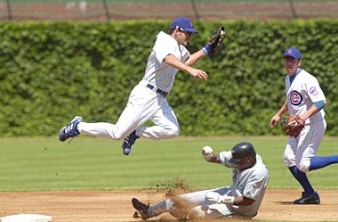 Shortstop Alex Gonzalez #8 of the Chicago Cubs leaps to make a catch of a high throw from catcher Todd Hundley as second baseman Luis Castillo #1 of the Florida Marlins slides in safely during a game at Wrigley Field in Chicago, Illinois.