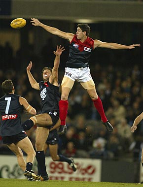 Jeff White #34 for Melbourne contests ruck, during the Round 15 Carlton Blues v Melbourne Demons AFL match, played at Colonial Stadium, Melbourne, Australia.