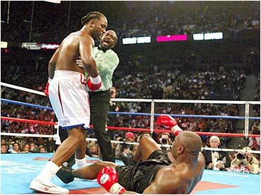 Referee Eddie Cotton holds back Lewis as Tyson is knocked to the canvas in round 4. The fall was rulled a slip by referee.