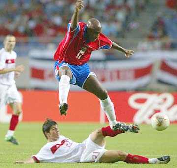 Hernan Medford of Costa Rica hurdles the challenge of Emre Belozoglu of Turkey during the FIFA World Cup Finals 2002 Group C match played at the Incheon Munhak Stadium, in Incheon, South Korea.
