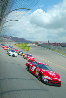 Bill Elliott, driver of the #9 Evernham Motorsports Dodge Intrepid RT, leads a pack of cars during the Sirius Satellite Radio 400 at the Michigan International Speedway in Brooklyn, Michigan.