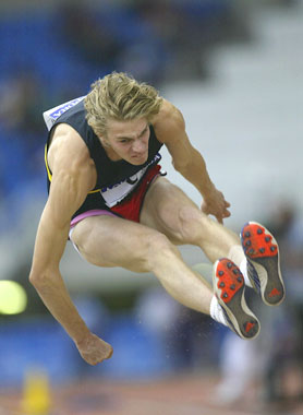 Christopher Tomlinson of Ireland goes on win the men's Long Jump at the trials of the Manchester 2002 Commonwealth Games at the City of Manchester Stadium in Manchester, England.