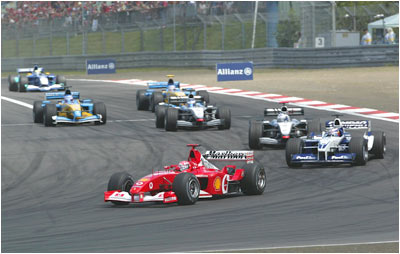 Barrichelo (not in the pic) led from the start of the race leaving pole starter Montoya in his wake. Michael Schumacher of Germany and Ferrari leads Juan Pablo Montoya of Colombia and Williams.