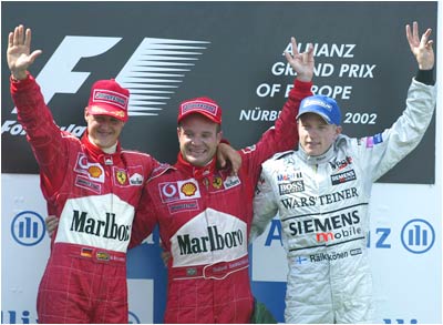 The win moved Rubens Barrichello to fourth in the driver's championship. Michael Schumacher still has a stranglehold on the title . Kimi Raikkonen moves into sixth place.