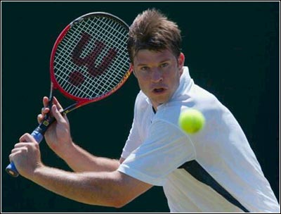 Barry Cowan of Great Britain in action against Nicolas Lapentti of Ecuador. Cowan is the youngest competitor at the championships this year. He lost 6-4, 4-6, 3-6, 2-6.