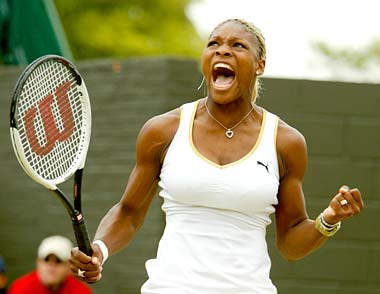 World No. 2 Serena Williams shouts in triumph after scrambling into the fourth round with a tight 7-6, 7-6 victory over Els Callens.