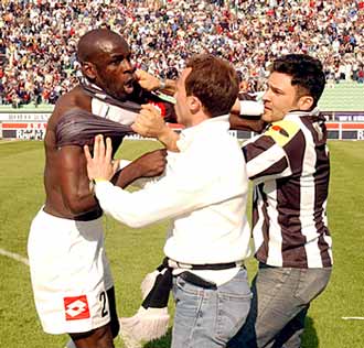 Lilian Thuram of Juventus has his shirt removed by Juventus fans celebrating their team's championship victory following the Serie A match between Udinese and Juventus, played at the Friuli Stadium, Udine.