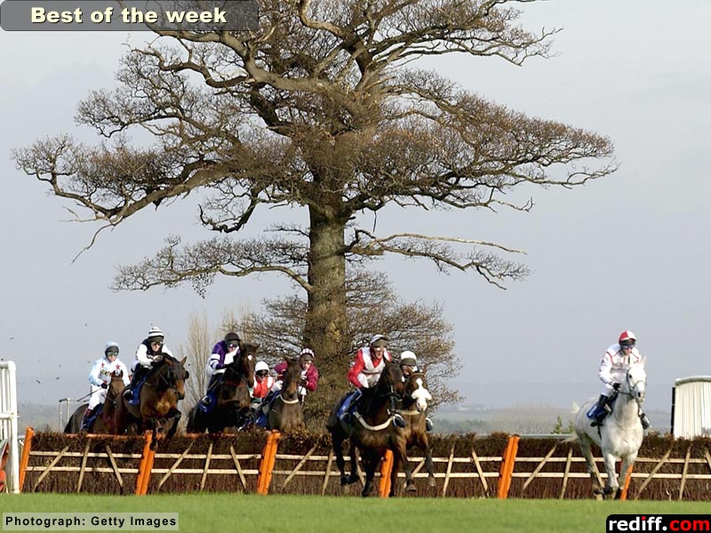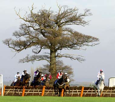 Marcus Foley and Spring Dawn lead the runners over the 1ST flight during Division I of The Black Tom Putt Maiden Hurdle Race run at Taunton Racecourse in Taunton.